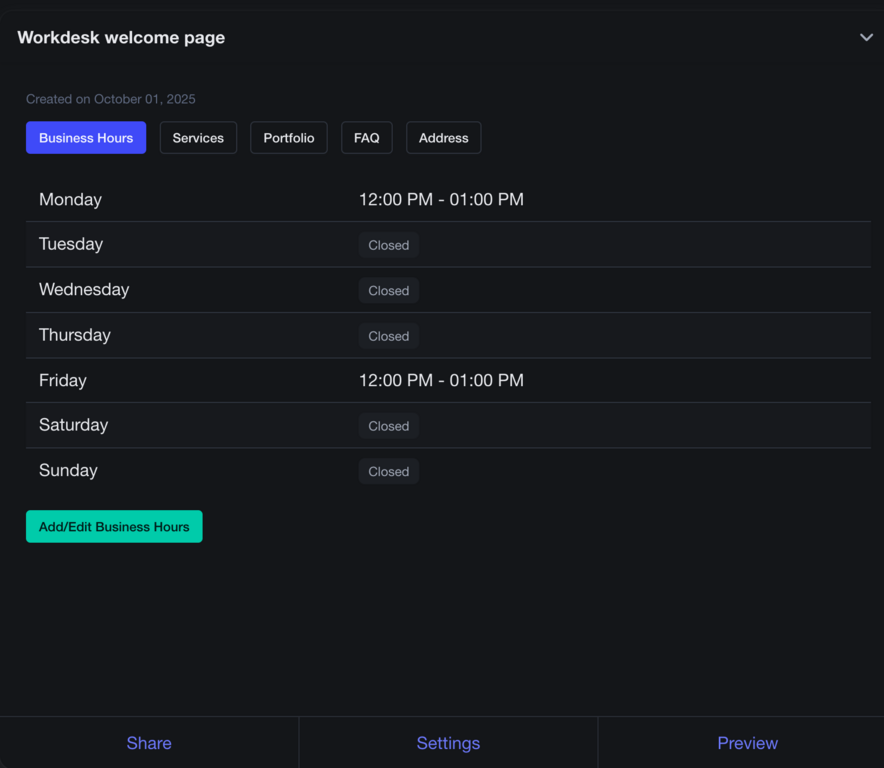 Click on “Hours” > “Edit business hours” Set your working hours for each day.